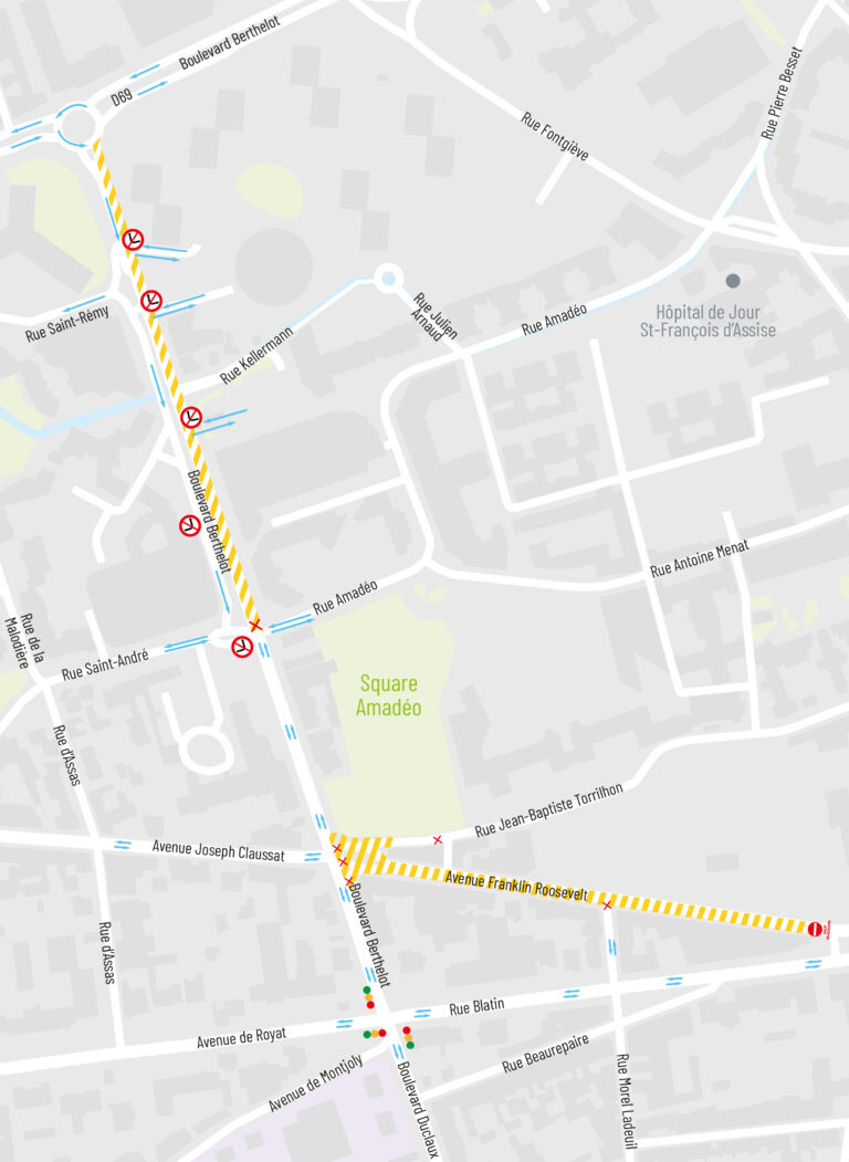 Pendant les travaux, le boulevard Berthelot est mis en sens unique, il est circulable dans le sens nord – sud.