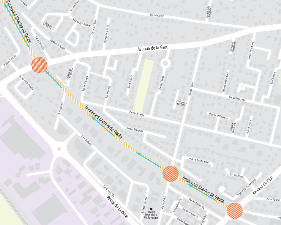 Le boulevard Charles de Gaulle est mis en sens unique (circulation uniquement depuis Cournon-d’Auvergne vers Clermont-Ferrand) entre le rond-point avec l’avenue du Midi et celui avec l’avenue du Maréchal Leclerc.
