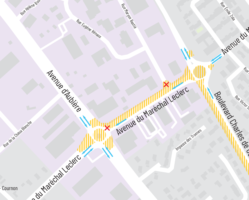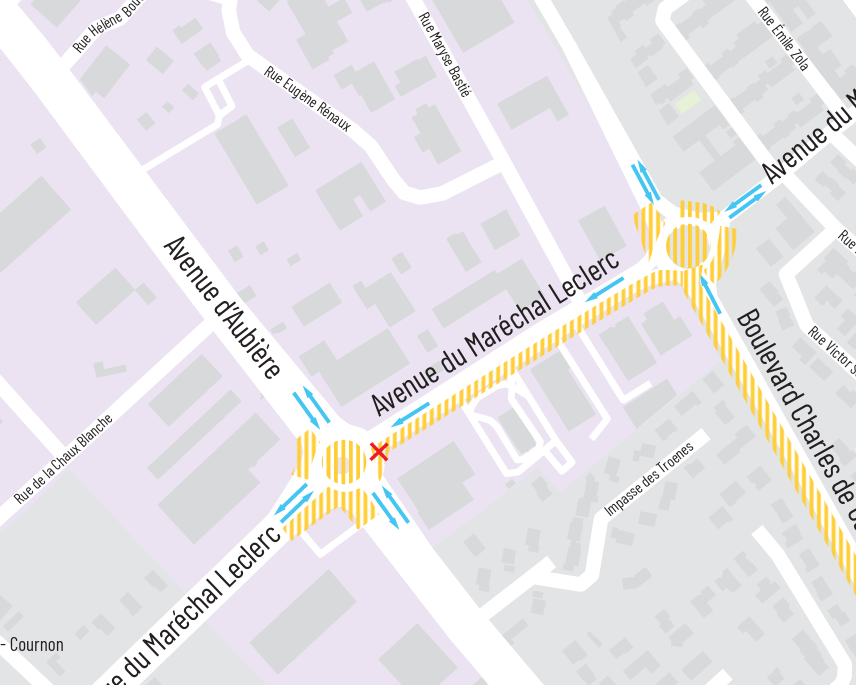 L’avenue du Maréchal Leclerc est mise en sens unique (circulation uniquement depuis Cournon-d’Auvergne vers Clermont-Ferrand) entre le rond-point avec le boulevard Charles de Gaulle et celui avec l’avenue d’Aubière.
