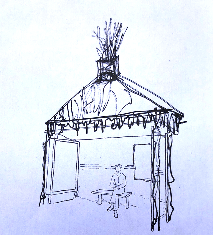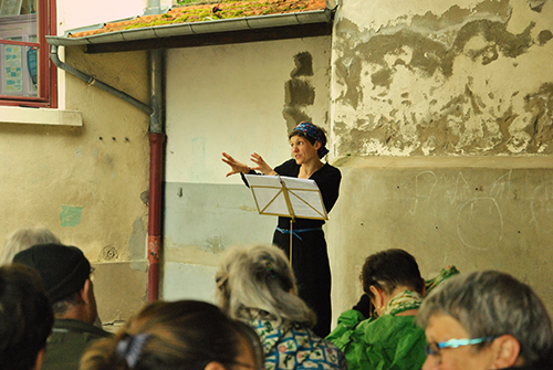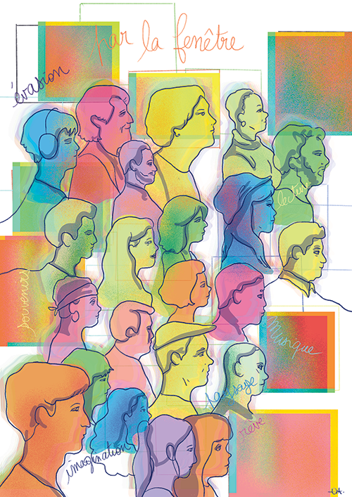 Ils sont deux. Ils ont trouvé refuge ici. Elle invite les passagers à s’installer tout près et leur offre des textes qu’elle écrit. Il les fait résonner en musique. Le voyageur repart avec leurs mots et leurs notes.