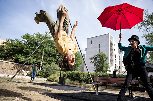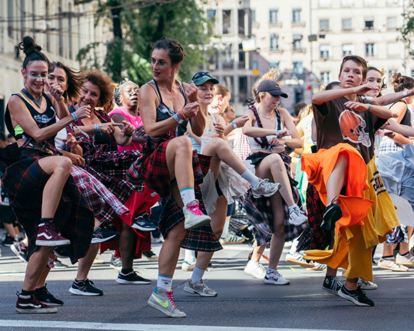Deux danseurs prennent la parole et ouvrent le pas sur une douce manifestation joyeuse et visuelle. Leur seul but, distribuer une pensée heureuse pour imaginer ensemble une vision idéale du monde.
